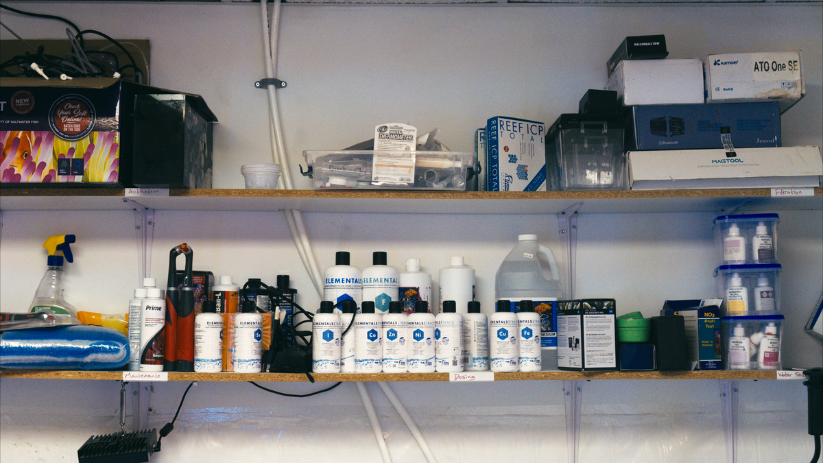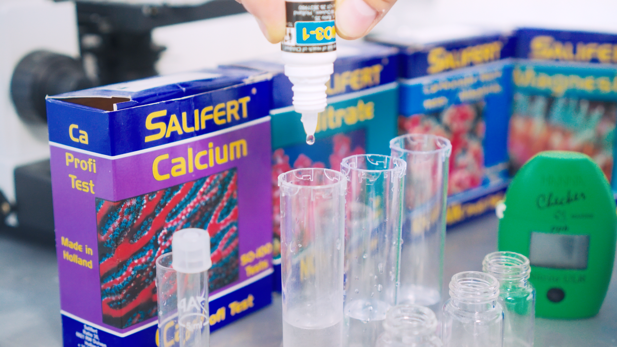 In the coral lab, we use professional water testing materials, water treatments, phytoplankton, and test kits.