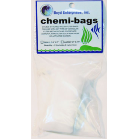Chemi Bags are double stitched nylon filter bags for use with any type of granular filter media such as Phosphate, Ammonia, Nitrate, Silicate removers or activated carbon. Each package contains (2) bags – approximate size 4.5” x 9” to fit in most filtration systems (including 2 nylon ties).